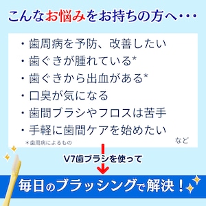 歯ブラシ一本で、歯の表面から歯間の隅々までしっかりとブラッシング。多くの歯科医師に支持され、全国の歯科医院でも実績のあるV7歯ブラシ。つまようじ法に基づいた磨き方で、歯周病の予防とケアをサポートします。