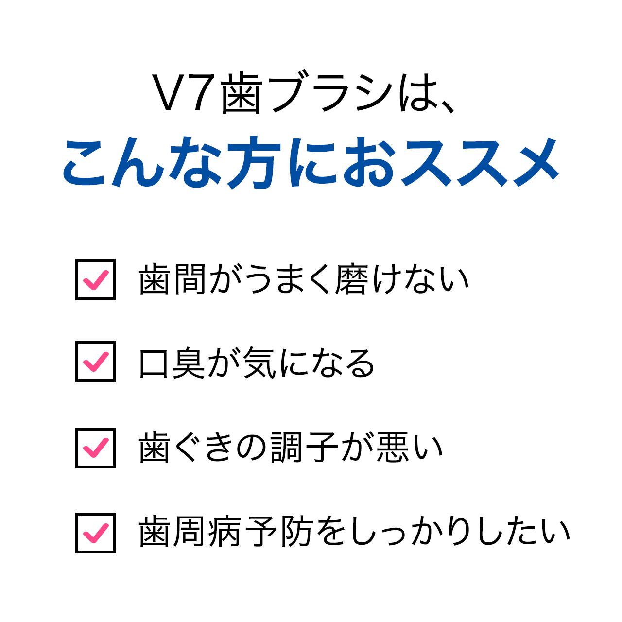 歯ブラシ一本で歯の表面から歯間のすみずみまでブラッシング。さらにマッサージ効果で歯ぐきが強くなります。歯のぐらつきや口臭を改善。株式会社ピー・エム・ジェーがV7歯ブラシを発売してから30年以上、多くの歯科医師も推奨し、全国各地の歯科医院様で採用されています。つまようじ法は歯周病の予防と治療のための歯磨き法です。つまようじ法で歯周病菌に負けない強い歯と歯ぐきを作りましょう!